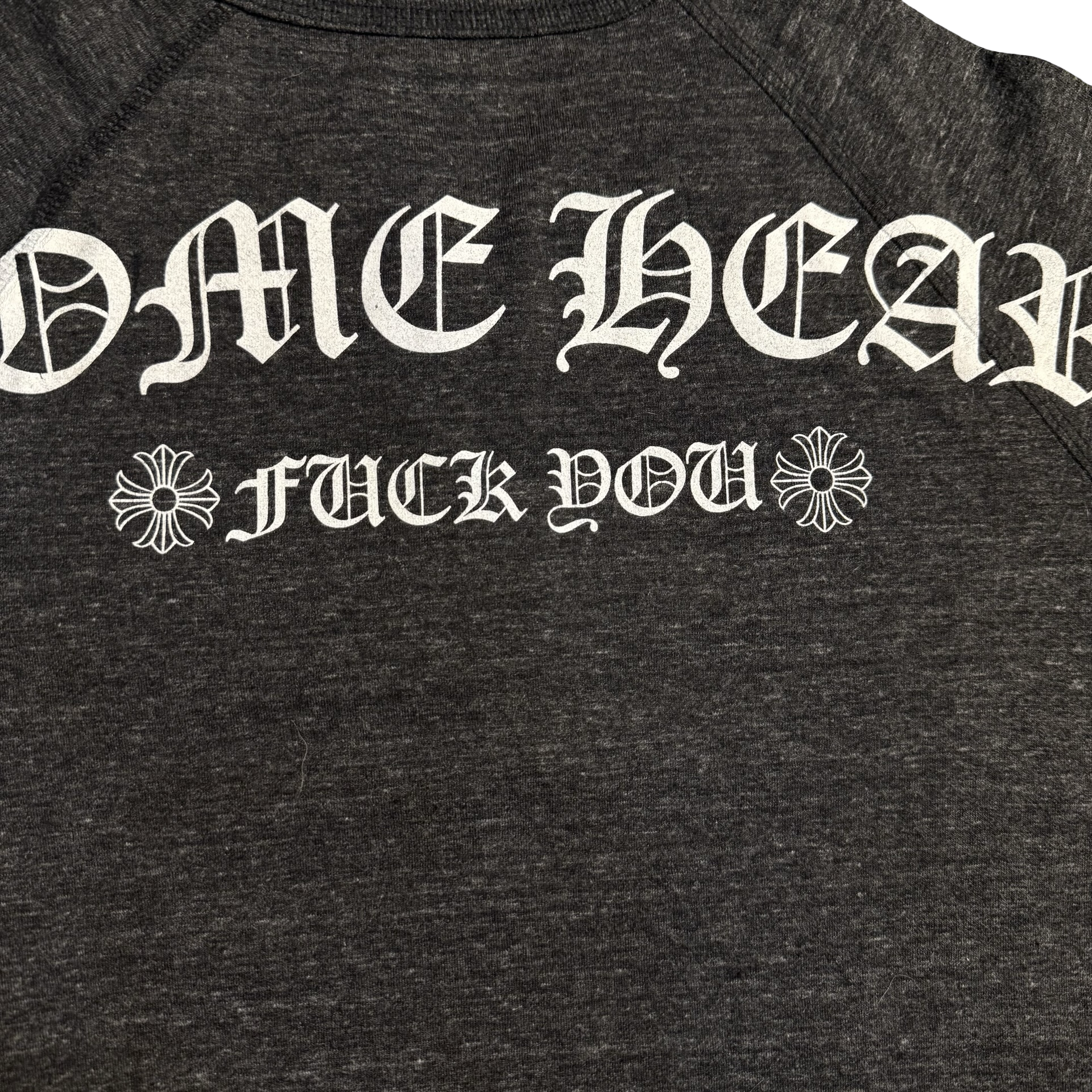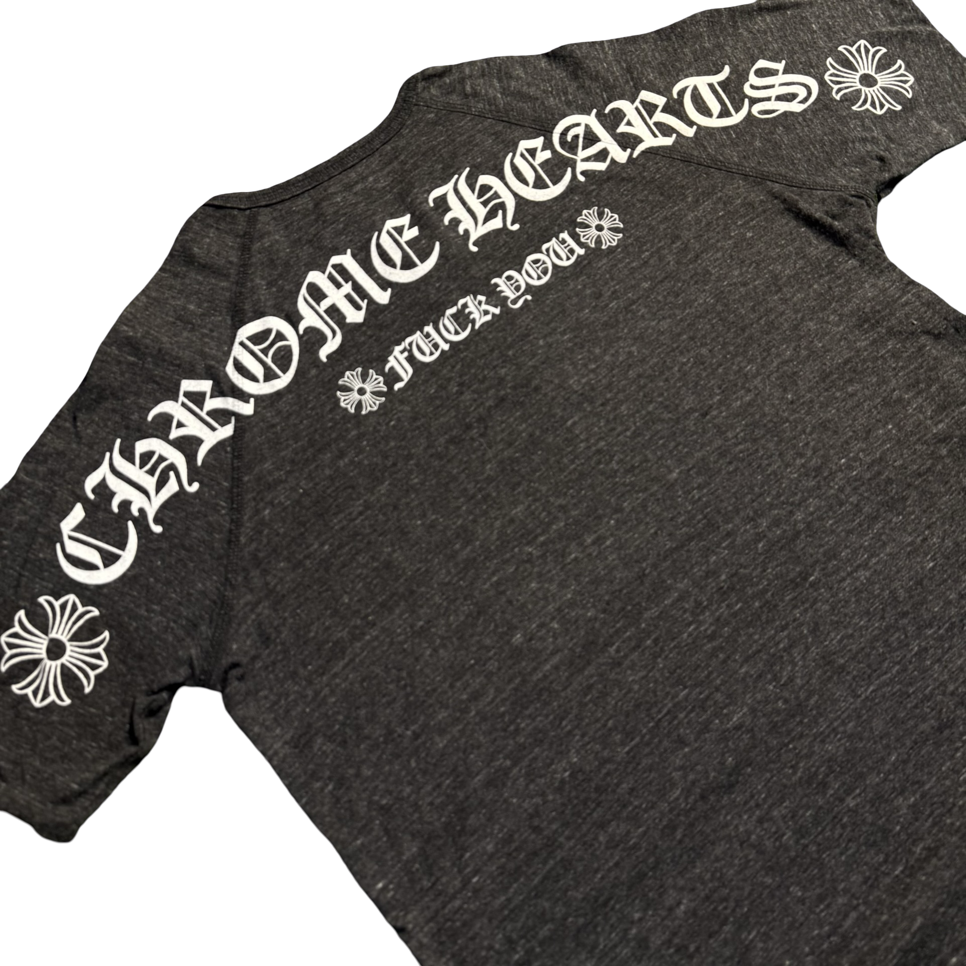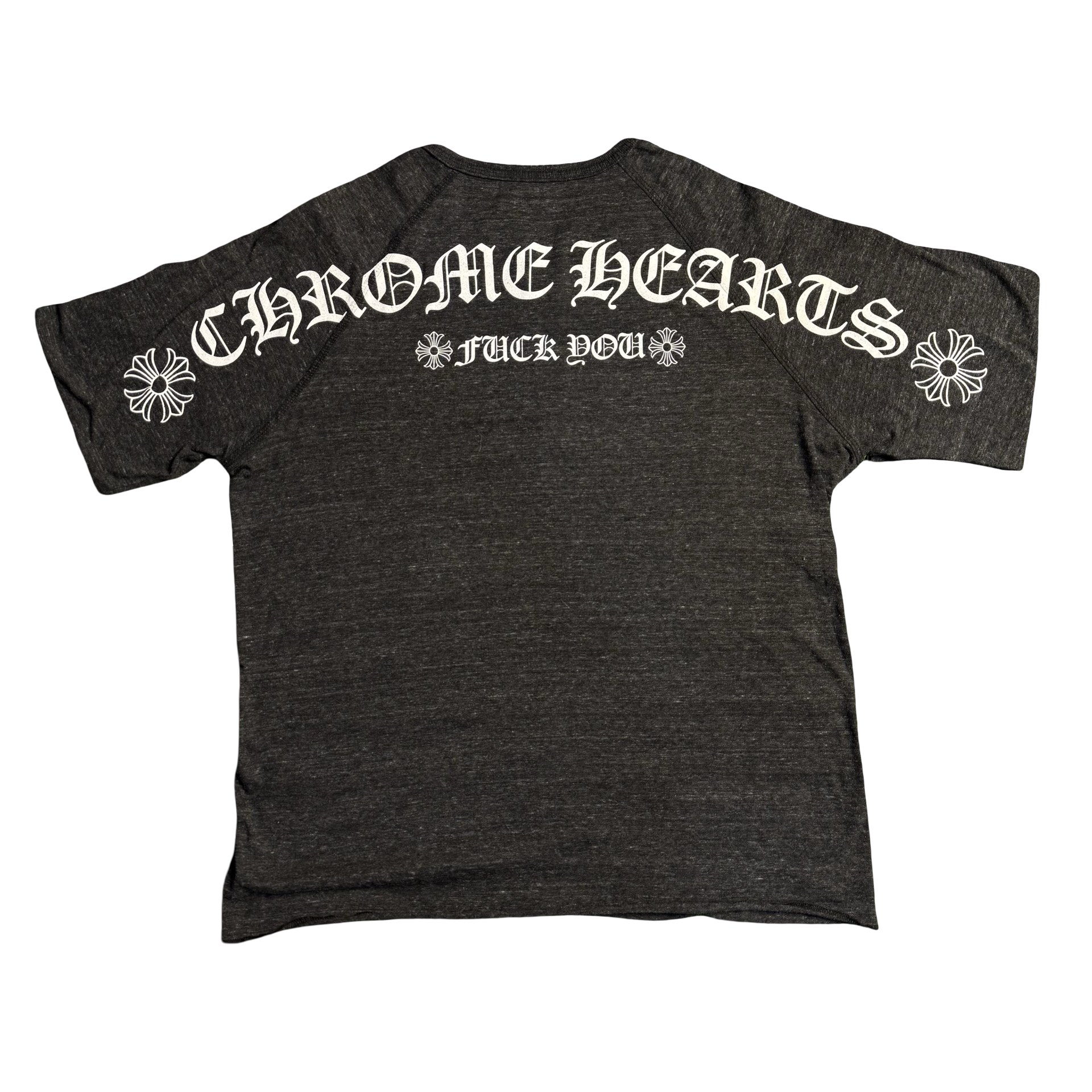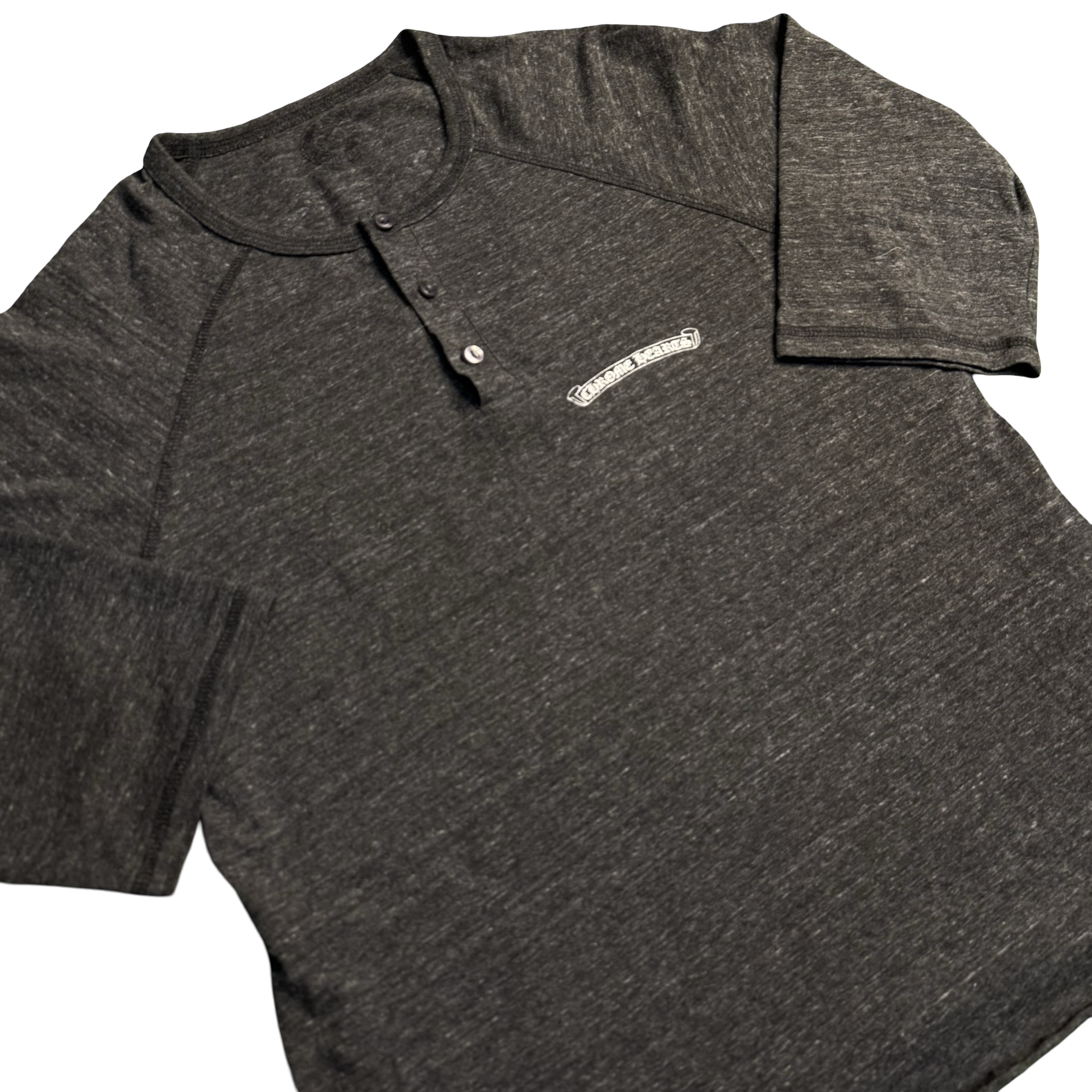 Charcoal henley featuring signature Chrome Hearts script at the chest and gothic “CH” detail at the hem. Back graphic showcases oversized Chrome Hearts lettering with floral accents and bold statement print. Three-button placket with a relaxed raglan silhouette — rare, sharp, and unmistakably Chrome.