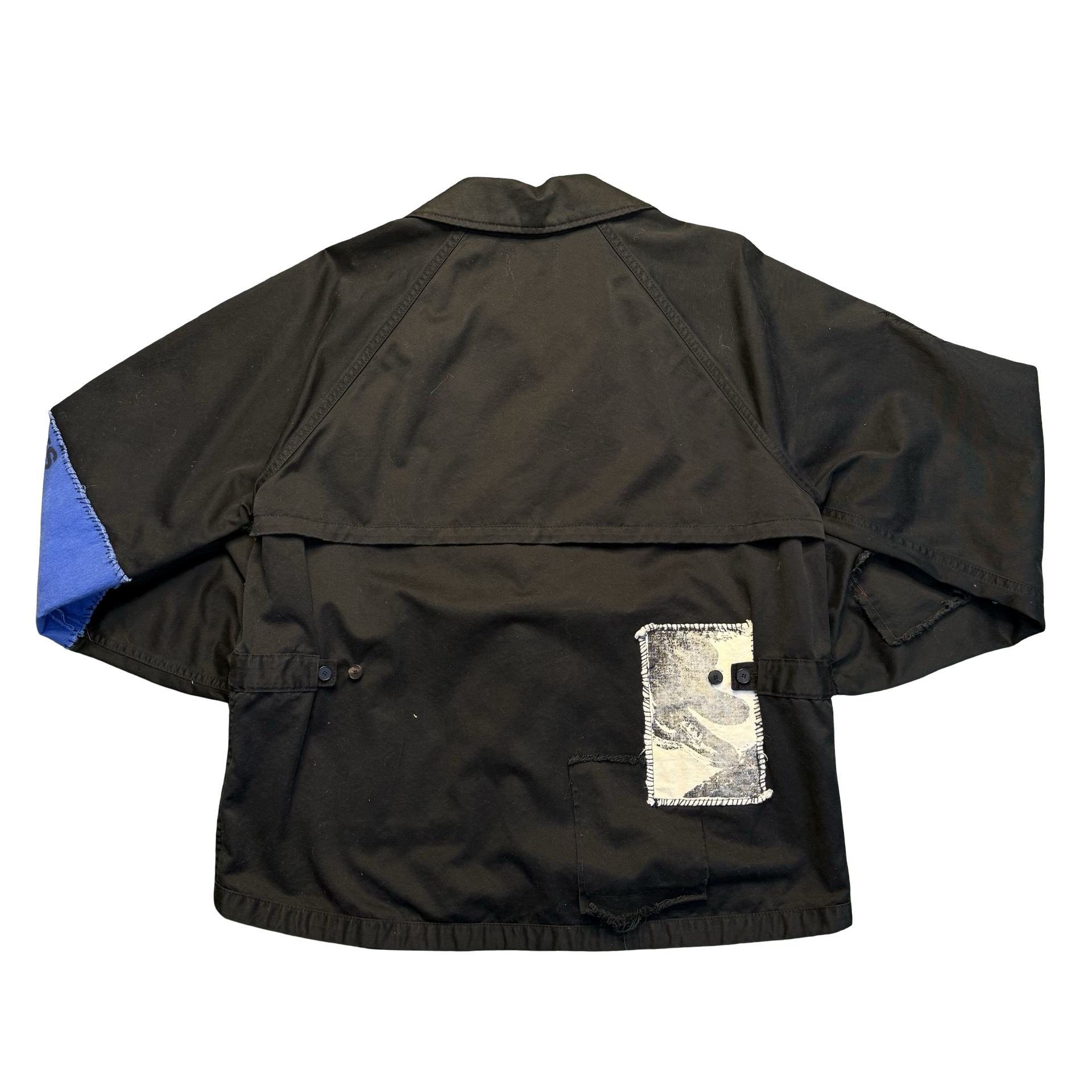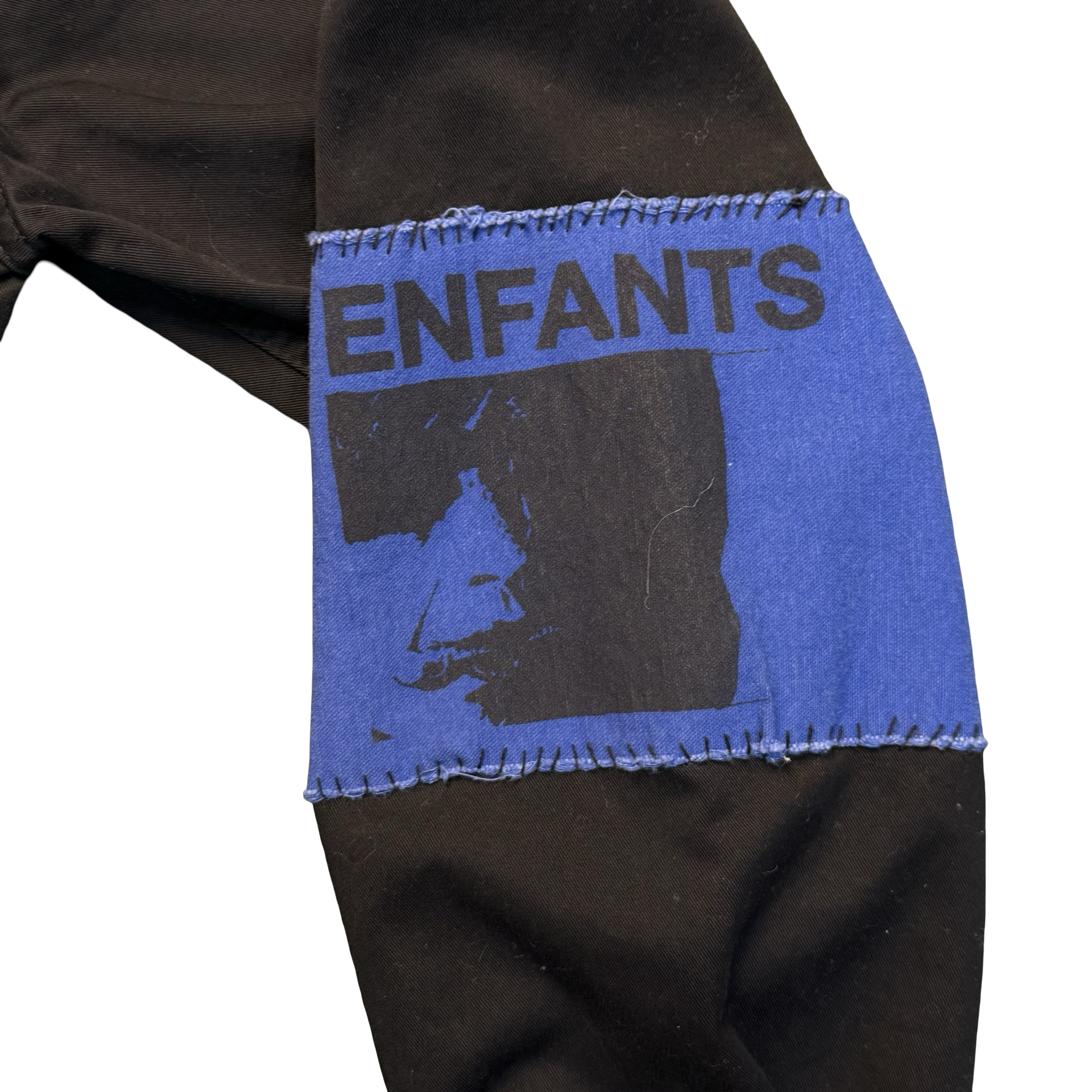Black utility-style jacket from Enfants Riches Déprimés featuring a button front, multiple pockets, and standout patch detailing throughout — including a bold blue armband graphic and distressed artwork patch on the front. Raw, punk, and super wearable.
