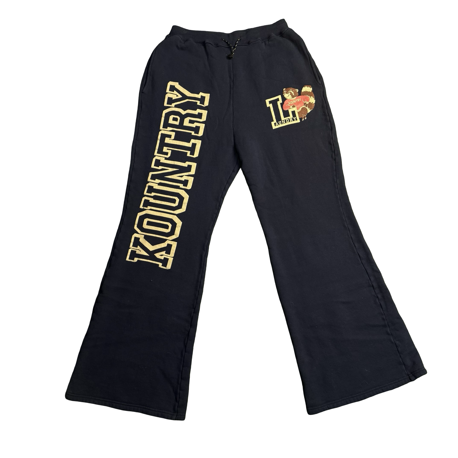 Navy flared sweatpants featuring bold cream “KOUNTRY” lettering down the leg and signature Kapital Kountry raccoon graphic at the hip. Relaxed fit with a subtle flare and structured drape — playful, rare, and unmistakably Kapital.